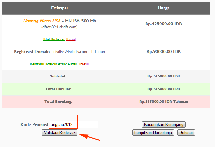- Kode Promo : angpao2012 (Masukkan kedalam kolom kode promosi pada order Anda dan klik tombol Validasi Kode –contoh-, agar harga hosting terdiskon 50%).